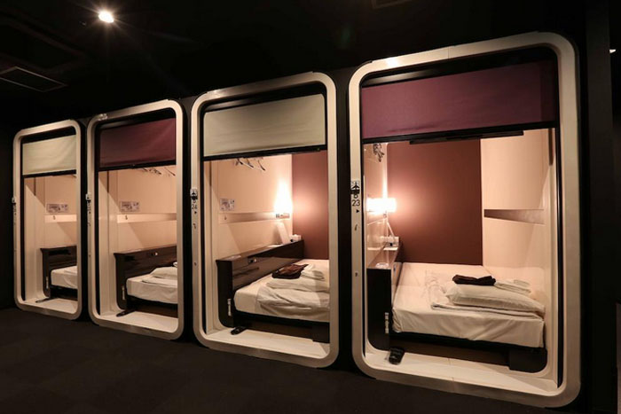 โรงแรมแคปซูล เหมาะกับนักท่องเที่ยวที่เดินทางคนเดียว อยู่ในตึก Gate ‘s ชั้น 8 ทางเข้าสถานี Nakasu-Kawabata อยู่หน้าตึกเลย ที่พักเเบ่งเเยกชาย-หญิง ระบบเข้าคีย์การ์ด ตกแต่งทันสมัย กั้นเป็นห้องส่วนตัว ห้องไม่แคบนอนได้สบาย มีทีวีให้แต่ละห้อง พร้อมหูฟังสำหรับฟัง มีไฟในห้อง ปรับระดับแอร์ได้ มีอุปกรณ์ให้ครบ มีชุดนอนให้เปลี่ยน ภายในห้องมีล็อกเก็บของซึ่งจะมีกุญแจให้ ห้องน้ำมีทั้งห้องอาบน้ำ และมีอ่างแช่ออนเซน อุปกรณ์อาบน้ำครบ ที่นี่ยังมีเครื่องซักผ้า อบผ้าหยอดเหรียญ และเครื่องจำหน่ายเครื่องดื่มอัตโนมัติ ชั้นล่างของตึกมีร้านอาหารหลายร้าน และร้านดองกี้ (Donki) ที่เปิดตลอด 24 ชั่วโมง ฝั่งตรงข้ามมีร้านข้าวหน้าเนื้อ Matsuya และร้าน Ichiran Ramen ใกล้ 7-eleven และ Family Mart ที่ด้านหลังอาคาร