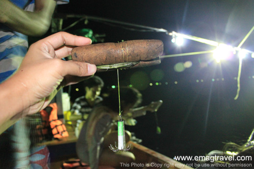 พี่บัวลอยหยิบอุปกรณ์จับหมึกแจกเราคนละชุด เป็นตะขอปลายแหลมซักประมาณ 10 ก้าน พูดติดกับเส้นเอ็น ไม่ต้องมีเหยื่อนะครับ