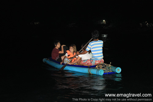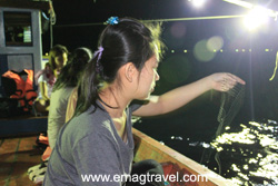 เรือแล่นออกจากเกาะมาเรื่อยๆ ประมาณ 30 นาที ทะเลมืดมาก มองไปไกลๆ เห็นแต่เรือประมงเปิดไฟเขียวๆ จับหมึก จับปลากันอยู่ไกลๆ