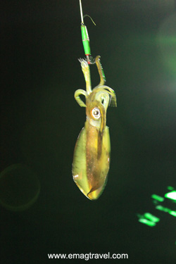 วิธีตกก็โยนอุปกรณ์ที่ว่านี้ลงไปลึกๆ เลยแล้วก็กระตุกเส้นเอ็นเป็นพักๆ ประมาณว่าทำให้เคลื่อนไหวคล้ายสิ่งมีชีวิตในน้ำ พอหมึกเห็นก็จะเข้าไปจับกิน ด้วยการเอาหนวดไปพัน แล้วก็จะติดกับตะขอปลายแหลม ส่วนที่เปิดไฟก็เพื่อให้หมึกมองเห็นได้