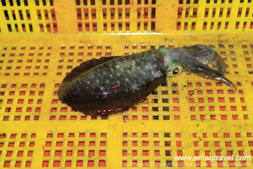 หมึกตอนที่ขึ้นมาใหม่ๆ จะตัวใสๆ ดิ้นซักพักนึงก็หมดแรง จากนั้นก็เปลี่ยนเป็นสีดำขึ้น เมื่อตายสนิทก็จะเป็นสีขาวเหมือนที่ขายตามตลาด