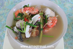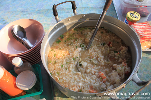 มื้อเช้ามีขนมปัง แยม กาแฟ กับข้าวต้มทะเลมีหมึก + กุ้ง เยอะมาก มาเป็นหม้อใหญ่ กินยังไงก็ไม่หมด ทริปนี้อาหารทะเลตลอด โดยเฉพาะหมึก กินเยอะทุกมื้อ สำหรับรสชาติถือว่าอร่อยเลยละครับ