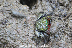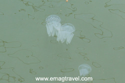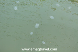 ก่อนที่จะถึงฝั่งเห็นฝูงแมงกระพรุนตัวเล็กเป็นร้อยๆ ตัว ว่ายจากคลองป่าชายเลนออกไปยังทะเล ดูแล้วน่ารักดีครับ คล้ายกับเยลลี่