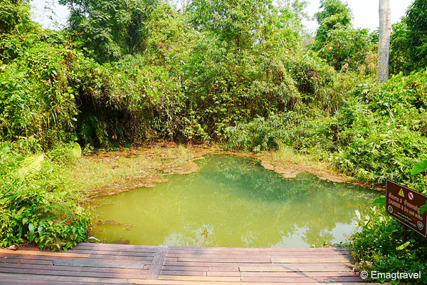 เดินไปได้ประมาณครึ่งทางก็จะเจอกับ “บ่อซับน้ำอุ่นภูซาง” เป็นต้นกำเนิดน้ำอุ่นที่ไหลไปยังน้ำตกภูซาง บ่อมีความลึก 5 เมตร กว้าง 10 เมตร อุณหภูมิในน้ำประมาณ 35 องศาเซลเซียส (ไม่ค่อยร้อน)