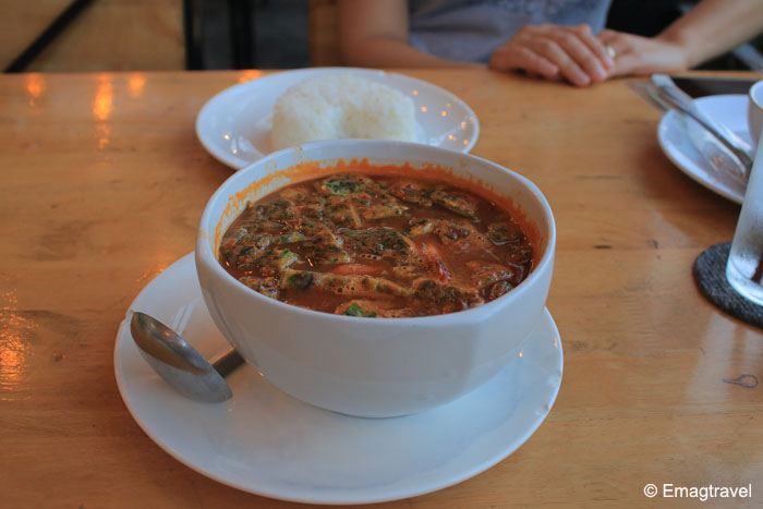 ความตั้งใจคือสั่งอันเนียน ริง มาทานเล่นก่อนกับข้าวมา ดูแล้วน่าจะทำได้ง่ายสุดด้วย แต่จานแรกที่มาเป็น แกงส้ม ชะอมกุ้ง เนื้อแกงดูเข้มข้น สีเข้ม ลองทานดู รสชาติหนักพริกแกงไปหน่อย โดดไป
