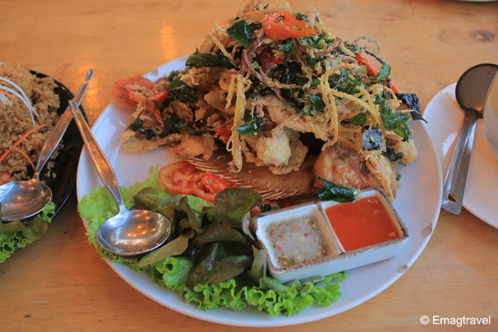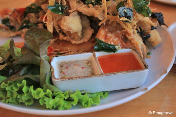 จานต่อมา ปลาทับทิมทอดสมุนไพร จานใหญ่สมราคา มีการแล่ปลาทอดเป็นชิ้น สะดวกในการทาน มีผักสมุนไพรทอดมาด้วย เช่น กระชายทอด ใบมะกรูด กระเพรา มาพร้อมน้ำจิ้มซีฟู๊ด และ ซอสพริก
