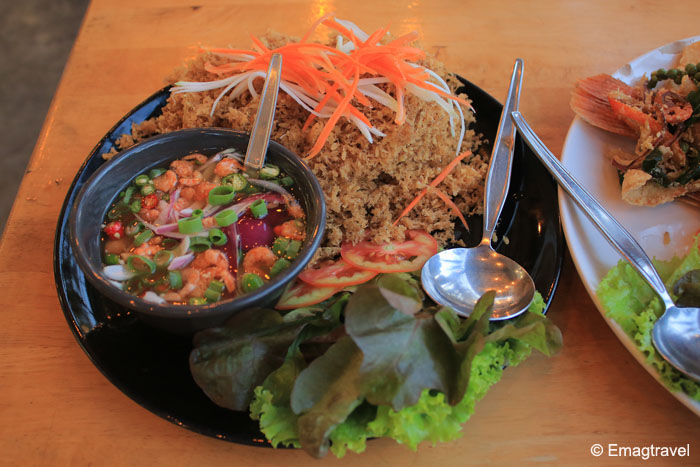 อ่านมาจาก Wongnai ว่าเมนูเด็ดของที่นี่จะเป็นสเต๊กขัวเหล็ก เมี่ยงปลาทับทิม ข้าวแมว ข้าวอบสัปปะรด ฟินสลัด แต่เราไม่ได้สั่ง เราสั่งเมนูที่อยากทานมา