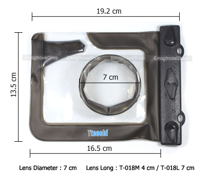 ซองกันน้ำกล้อง Tteoobl T-018M และ T-018L ราคาประหยัด สำหรับกล้อง Mirrorless เช่น Sony NEX, Alpha, Nikon 1, Olympus, Panasonic, Fujifilm, Casio EX-ZR1500, ZR2000, ZR3500 หรือกล้องคอมแพคไฮเอนด์ Canon G1X, G7X ใช้ใส่ดำน้ำ สน๊อกเกิ้ล (Snorkle) พายเรือ ล่องแก่ง เล่นกีฬาทางน้ำ, กันฝุ่น, กันความชื้น, หิมะ สินค้าใช้วัสดุ PVC ABS คุณภาพดี ตามมาตราฐานการกันน้ำ IPX8 กันน้ำได้ถึง 20 เมตร มีความยืดหยุ่นสูง หน้าเลนส์พลาสติกใส ที่ตัวซองมีช่องสำหรับสอดนิ้วเพื่อกดชัตเตอร์ทำให้ถ่ายภาพได้สะดวกใกล้เคียงกับตอนไม่ใส่ซองกันน้ำ